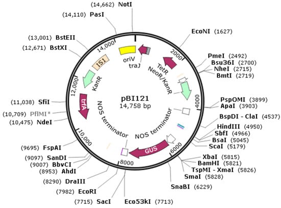 The plant overexpression vector used in this study is pBI12 (Figure 1), which contains the β-glucuronidase (GUS) gene. The expression of the GUS gene is controlled by the Cauliflower mosaic virus (CaMV) 35S promoter and the NOS terminator. Moreover, this plasmid is resistant to kanamycin (Kana). The pBI121 plasmid has been used to establish the transient expression in plants such as Pyrus betulifolia Bunge. [39] and Iris foetidissima L. [40].