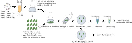 The Agrobacterium solution was successfully converted to the pBI121-GUS empty carrier and shaking culture to OD600 was 0.4~0.6, then centrifuged at 5000 rpm for 20 min. The resuspension (MS + 1 mM MES + 2 mM MgCl2 + 100, 200, 300 μM Ace + 30 g·L−1 sucrose, pH = 5.8) was added to the collected cells, and the cells were resuspended at OD600 of 0.4, 0.8, 1.2, 28 °C, 100 rpm for 2 h. The 2-month, 4-month, and 6-month-old leaves of H. villosa were completely immersed in the resuspended Agrobacterium solution and infected for 20 min, 40 min, and 60 min, respectively. Then, the leaves and bacterial solution were transferred to a50 mL sterile syringe, sealed at the injection port, and subjected to negative pressure treatment by drawing the syringe 0, 5, and 10 times, each for 5 cm. After that, the leaves were rinsed three times with sterile water and the bacterial solution on the leaves surface was dried with filter paper, and the leaves were flatted up on the culture medium (MS + 30 g·L−1 sucrose + 7 g·L−1 agar + 0.8 mg·L−1 6-BA + 0.2 mg·L−1 IBA + 10 μM Ace, pH = 5.8), and co-cultured for 1, 2, and 3 days at 25 °C in the dark. Each treatment was repeated three times, with 15 leaves in each group. In this experiment, a single factor was used as a single variable, and other factors were used as the standard. By observing and counting the percentage of leaves that turn blue after GUS staining, the transient transformation system was established and optimized. The trial flow is summarized in Figure 2.