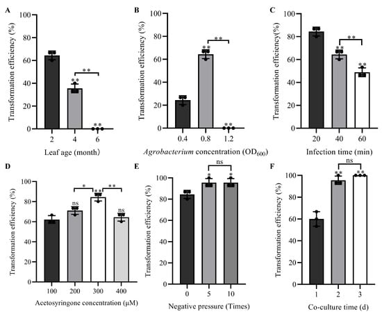 Screening of influencing factors of instantaneous transformation system. (A) Leaf age. (B) Agrobacterium concentration. (C) Infection time. (D) Acetosyringgone concentration. (E) Negative pressure. (F) Co-culture time. Error bars indicate standard deviation of three replicates. To optimize the individual parameter, each experiment contained 15 samples, and each experiment had 3 replications. The bar indicates a standard error (SE) of three replicates. Asterisks display the level of significance. * p < 0.05, ** p < 0.01, ns p > 0.05 (ANOVA).