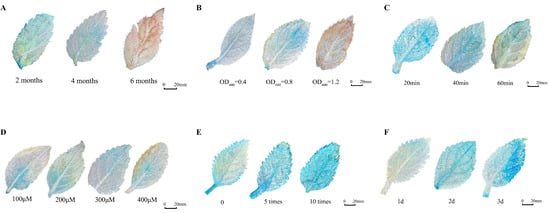 GUS staining results of transient transgenic H. villosa leaves. (A) Leaf age. (B) Agrobacterium concentration (OD600). (C) Infection time. (D) Acetosyringgone concentration. (E) Negative pressure. (F) Co-culture time. The experiments were repeated three times with similar results.
