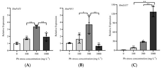 Relative expression analysis of three stress-resistant genes in H. macrophylla ‘Jiacheng’ under Pb stress. (A) HmPAT1 relative expression. (B) HmPIF1 relative expression. (C) HmZAT7 relative expression. The bar indicates a standard error (SE) of three replicates. Asterisks display the level of significance. * p < 0.05, ** p < 0.01, ns p > 0.05 (ANOVA).