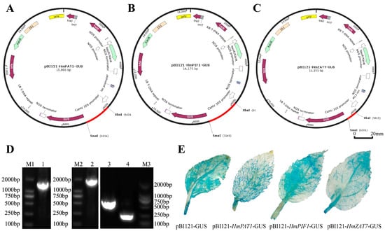 The construction of the pBI121-HmPAT1-GUS/pBI121-HmPIF1-GUS/pBI121-HmZAT7-GUS vector is shown as Figure 6A–C. The constructed pBI121-HmPAT1-GUS/pBI121-HmPIF1-GUS/pBI121-HmZAT7-GUS was transformed into the Agrobacterium-competent GV3101 using the freeze–thaw method. Single colonies were picked and cultured at 28 °C until the OD600 was 0.4~0.6, and the bacterial solution was identified by PCR. Products of approximately 1170 bp, 1425 bp, and 441 bp were amplified from the Agrobacterium suspensions of the three different recombinant plasmids, respectively (Figure 6D). The products were all of the expected size, indicating that the plant overexpression recombinant plasmids pBI121-HmPAT1-GUS/pBI121-HmPIF1-GUS/pBI121-HmZAT7-GUS and Agrobacterium transformations were successful.