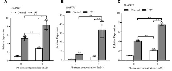 Transient expression analysis of Hydrangea Pb-tolerant genes under Pb stress. (A) HmPAT1 relative expression. (B) HmPIF1 relative expression. (C) HmZAT7 relative expression. The bar indicates a standard error (SE) of three replicates. To optimize the individual parameter, each experiment contained at least 10 samples, and each experiment had 3 replications. Asterisks display the level of significance. * p < 0.05, ** p < 0.01, ns p > 0.05 (ANOVA).