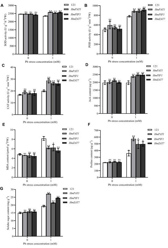 Analysis of physiological indices in H. villosa leaves with transient overexpression of stress Pb-resistance genes. (A) SOD activity. (B) POD activity. (C) CAT activity. (D) AsA content. (E) MDA content. (F) Proline content. (G) Soluble sugar content. The bar indicates a standard error (SE) of three replicates. To optimize the individual parameter, each experiment contained at least 10 samples, and each experiment had 3 replications. Asterisks display the level of significance. * p < 0.05, ** p < 0.01, ns p > 0.05 (Student’s t-test, using pBI121 as the control group for each gene).