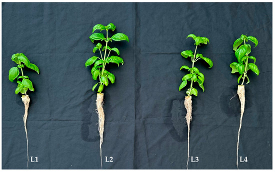 Hydroponically grown sweet basil plants under different light conditions for 16 days in the tropical greenhouse. Refer to Table 1 for details of L1, L2, L3, and L4 treatments.