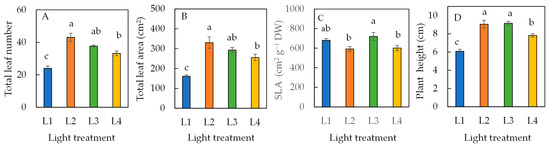Total leaf number (A), total leaf area (B), specific leaf area, SLA (C), and plant height (D) of sweet basil grown under different light conditions for 16 days. Values are means ± standard errors. Means with different letters are statistically different (p < 0.05; n = 6) as determined by Tukey’s multiple comparison test. Refer to Table 1 for details of L1, L2, L3, and L4 treatments.
