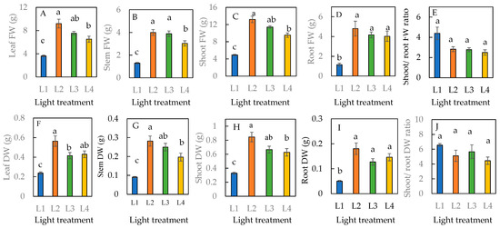 Leaf fresh weight (FW) (A), stem FW (B), shoot FW (C), root FW (D), shoot/root FW ratio (E), leaf dry weight (DW) (F), stem DW (G), shoot DW (H), root DW (I), and shoot/root DW ratio (J) of sweet basil grown under different light conditions for 16 days. Values are means ± standard errors. Means with different letters are statistically different (p < 0.05; n = 6) as determined by Tukey’s multiple comparison test. Refer to Table 1 for details of L1, L2, L3, and L4 treatments.