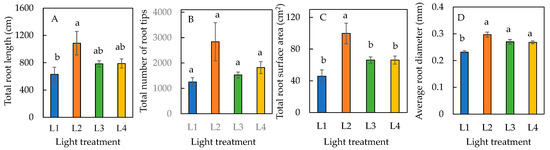 Total root length (A), total number of root tips (B), total root surface area (C), and average root diameter (D) of sweet basil grown under different light conditions for 12 days. Values are means ± standard errors. Means with different letters are statistically different (p < 0.05; n = 6) as determined by Tukey’s multiple comparison test. Refer to Table 1 for details of L1, L2, L3, and L4 treatments.