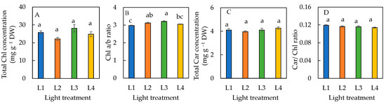 Total Chl concentration (A), Chl a/b ratio (B), total Car concentration (C), and Car/Chl ratio (D) of sweet basil grown under different light conditions for 12 days. Values are means ± standard errors. Means with different letters are statistically different (p < 0.05; n = 6) as determined by Tukey’s multiple comparison test. Refer to Table 1 for details of L1, L2, L3, and L4 treatments.