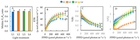 Midday Fv/Fm ratio (A), ETR (B), effective quantum yield of PSII, Y(II) (C), and NPQ (D) of sweet basil grown under different light conditions for 12 days. Values are means ± standard errors. Means with different letters are statistically different (p < 0.05; n = 6) as determined by Tukey’s multiple comparison test. Refer to Table 1 for details of L1, L2, L3, and L4 treatments.
