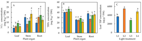 NO3− (A) and total reduced nitrogen, TRN (B) concentrations in various plant organs, and leaf total soluble protein, TSP (C) of sweet basil grown under different light conditions for 12 days. Values are means ± standard errors. Means with different letters are statistically different (p < 0.05; n = 4) as determined by Tukey’s multiple comparison test. Refer to Table 1 for details of L1, L2, L3, and L4 treatments.