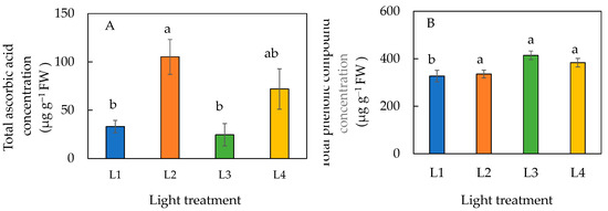 Total ascorbic acid concentration (A) and total phenolic compound concentration (B) of sweet basil grown under different light conditions for 12 days. Values are means ± standard errors. Means with different letters are statistically different (p < 0.05; n = 6) as determined by Tukey’s multiple comparison test. Refer to Table 1 for details of L1, L2, L3, and L4 treatments.