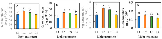 Dietary minerals, K concentration (A), Ca concentration (B), Mg concentration (C), and Fe concentration (D) of sweet basil grown under different light conditions for 12 days. Values are means ± standard errors. Means with different letters are statistically different (p < 0.05; n = 4) as determined by Tukey’s multiple comparison test. Refer to Figure 1 for different light treatments of L1, L2, L3, and L4. Refer to Table 1 for details of L1, L2, L3, and L4 treatments.