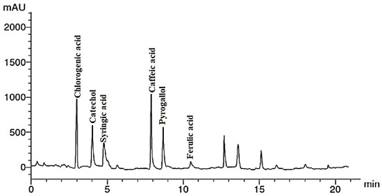 The phenolic compounds identified by the HPLC analysis in the Tropaeolum majus aqueous leaf extract (ALE) are shown in Table 2 and Figure 1. The most detected abundant phenolic compounds were caffeic acid (17.46 μg/mL), chlorogenic acid (15.22 μg/mL), pyrogallol (11.78 μg/mL), and catechol (10.62 μg/mL).