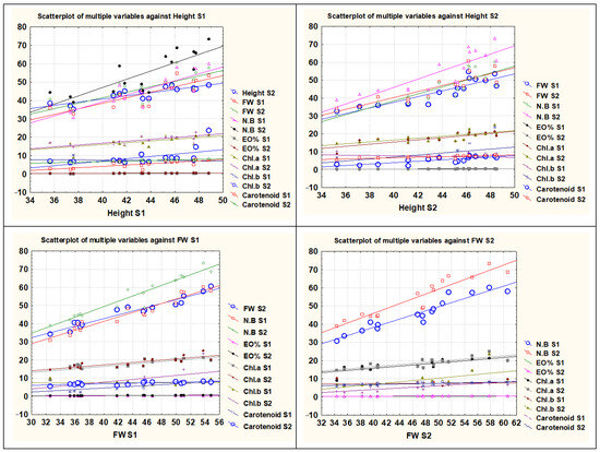 Additionally, good correlation results were found between the plant height in the second season with the total fresh weight in the first season (r = 0.88), the total fresh weight in the first season, and the EO% in the second season (r = 0.88), chlorophyll-a in the first season and the carotenoids in the second season (r = 0.88), and the number of branches/plant in the first season and the EO% in the second season (r = 0.88).