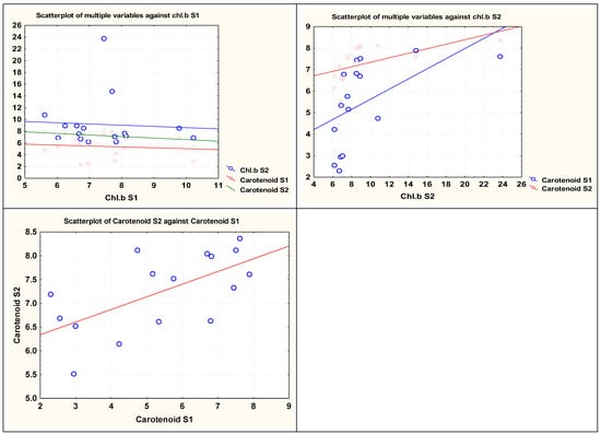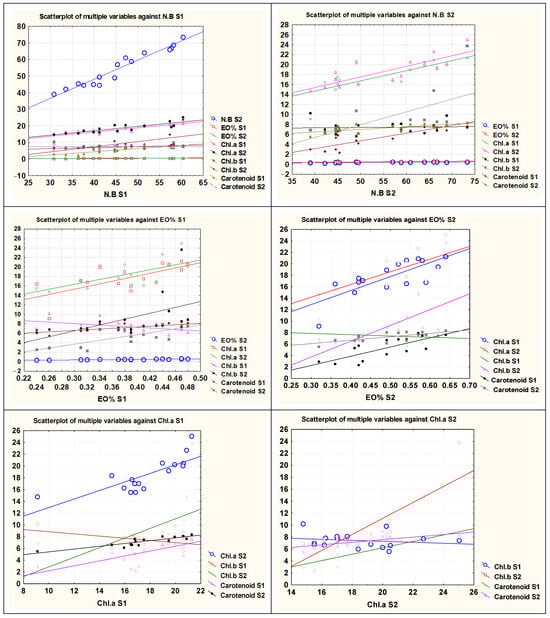 Furthermore, the results also reported good correlation results between the plant height with the EO% in the second season (r = 0.87), the number of branches/plant in the second season and the carotenoids in the first season (r = 0.87), the number of branches/plant and the EO% in the second season (r = 0.87), the plant height in both seasons (r = 0.86), the EO% in both seasons (r = 0.85), the plant height and the number of branches/plant in the second season (r = 0.85), and chlorophyll-a and chlorophyll-b in the second season (r = 0.85).
