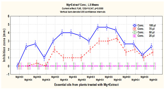 Antibacterial activity of the essential oils from Artemisia abrotanum against the plant pathogen bacterium Pectobacterium carotovorum subsp. carotovorum. *; The interaction between Mg+T. majus ALE and their concentration (Conc.).