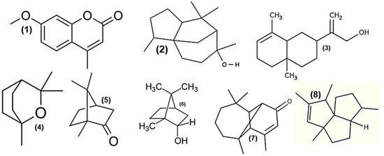 These main compounds had different concentrations in the EOs according to the treatment used. The ranges of these compounds were 0–1.51, 0–2.90, 0–7.20, 0–2.45, 4.05–10.91, 0–4.99, 1.10–3.33, 0.44–1.44, 9.57–13.2, 2.35–3.34, 5.42–7.01, 1.98–2.71, 3.62–5.20, 28.32–55.45, 3.58–5.90, and 1.64–3.09% for camphene, m-cymene, eucalyptol, camphor, endo-borneol, ascaridole, germacrene D, isoaromadendrene epoxide, cedrol, ledene alcohol, 7-epi-silphiperfol-5-ene, 1,5,9,9-tetramethyl-2-methylene-spiro[3.5]non-5-ene, α-costol, 7-methoxy-4-methylcoumarin (4-methylherniarin), longiverbenone, and caryophylla-4(12),8(13)-dien-5α-ol, respectively.