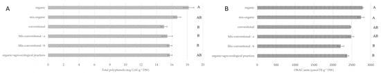 The total polyphenolic content measured through FCR assay and expressed as mg of gallic acid equivalents g-1 DW, showed (Figure 1) statistically significant differences among the six treatments (p ≤ 0.01). Higher values were found in the “Organic” treatment (18.17 ± 0.28 mg GAE∙g−1 DW), intermediate values in the Mix-organic” and “Organic + AEP” treatments (16.70 ± 0.30 mg GAE∙g−1 DW and 15.75 ± 0.68 mg GAE∙g−1 DW, respectively) and lower ones in the three conventional treatments (15.71 ± 0.46, 15.40 ± 0.41, and 14.98 ± 0.68 mg GAE∙g−1 DW, for “Mix conventional-b”, “Mix conventional-a”, and “Conventional”, respectively). The recorded total polyphenolic values were in accordance with the values reported for fennel cv. ‘Chiarino’ by Ninfali et al. in a previous work [31]. The differences found among the six treatments are in accordance with what previously reported by Salama et al. [32] who showed that organic and bio-organic fertilization produced an increase in total polyphenolic content in ‘Dolce’ and ‘Zefa fino’ fennel compared with conventional fertilization. As for ORAC assay, significant differences (p ≤ 0.01) were found among the treatments which partially reflected those found for total polyphenolic content. Indeed, higher values were recorded in the “Organic” (2785.39 ± 21.94 ORAC units) and “Mix-organic” (2743.04 ± 85.17 ORAC units) treatments while the lowest values were found in “Mix conventional-b” (2207.99 ± 82.31 ORAC units) and “Organic + AEP” (2378.03 ± 46.34 ORAC units). The ORAC assay’s sensitivity to different types of antioxidants and the specific conditions of the assay may account for this variation respect to the FCR assay. It is widely recognized that ORAC units are an expression of the antioxidant quality of raw food. Indeed, a daily intake of raw vegetables providing at least 3000–5000 ORAC units has been previously recommended to prevent the incipience of free radicals at a physiological level [33]. Our results show a relevant contribution of fennel in terms of antioxidant capacity, in accordance with another research [31]. The higher accumulation of secondary metabolites exerting relevant antioxidant capacities in organic fertilization treatments, compared to conventional ones, has also been reported for other horticultural products, such as cauliflower [19]. Moreover, a systematic review by Baranski et al. [34], based on an extensive dataset of 343 peer-reviewed publications, confirmed that organic crops have higher concentrations of polyphenols and a higher antioxidant activity. For over a decade, it has been suggested that the accumulation of secondary metabolites in organic products is linked to a C:N ratio unbalance. This imbalance is based on a transient nitrogen deficiency in organic management which induces the biosynthesis of carbon-rich phenylpropanoids [35]. In addition, it has been recently suggested that the organic farming practices promote a metabolism shift that ensures a continuous supply of carbon skeletons for the biosynthetic demands of organic plants [36]. Our results have shown that organic management produced a significant increase in total phenolics and ORAC units supporting the accumulation of carbon-rich phenylpropanoids as a consequence of the organic farming practice.