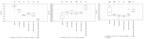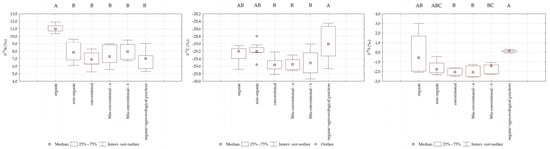 The Box and Whisker plots reported in Figure 2 are referred to the results of the stable isotope ratio analysis of 15N/14N [δ(15N)], 13C/12C [δ(13C)] and 34S/32S [δ(34S)] in fennel bulb samples of the six different treatments.