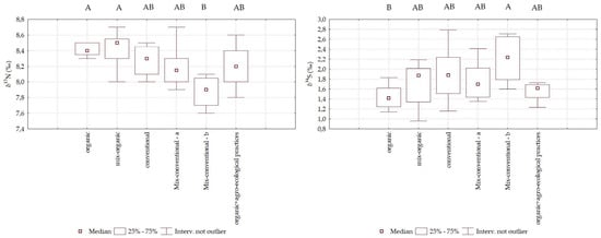 The different agronomic practices applied produced effects on the δ(34S) values. Significantly lower values (p ≤ 0.01) were found for the “Conventional” (−3.64 ± 0.12‰) and “Mix conventional-a” (−3.67 ± 0.07‰) treatments compared to “Organic” (−2.06 ± 0.50‰) and “Organic + AEP” (−1.81 ± 0.13‰). It is known that sulfur isotope ratio may provide supplementary information for the applied agricultural practice, as it is strictly related to the soil and the sulfate fertilizer employed [46,47]. Our results demonstrate that the soil of the conventional plots, which is different from the soil of the organic ones, produced useful insights into the discrimination of the agricultural regime.