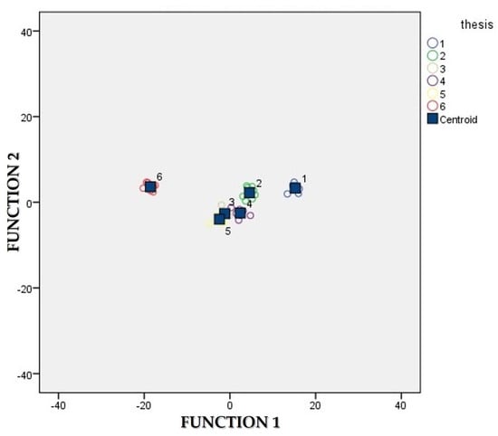 Graphical representation of the first two canonical discriminant functions. Treatments: (1) “Organic”; (2) “Mix-Organic”; (3) “Conventional”; (4) “Mix-Conventional-a”; (5) “Mix-Conventional-b”; and (6) “Organic + Agroecological practices”.