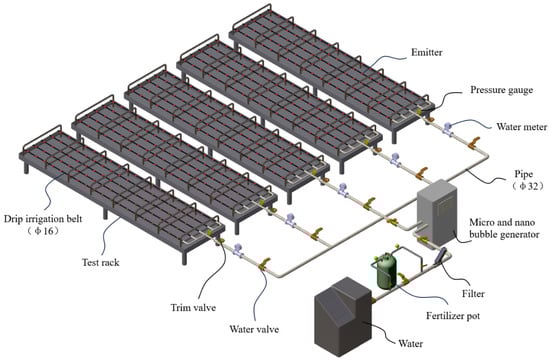 The experiment was conducted at the center of Water Saving Irrigation Equipment Testing, Institute of Agricultural-water saving, Chinese Academy of Agricultural Sciences, Xinxiang, China. To ensure the accuracy of the experimental results, an intelligent variable-frequency, constant-temperature, and constant-pressure water tank (Hebei Kedao Testing Machine Technology Co., Ltd., Xingtai, China) was used as the experimental power water source; U-PVC pipes were used as the experimental pipeline system; a turbine flowmeter (China National Instrument Co., Ltd., Beijing, China, accuracy 1.0, range 3–30 m3/h) was employed to monitor the experimental irrigation flow rate; a differential pressure fertilizer tank of 30 L (Shandong Toyota Water-saving Equipment Co., Ltd., Laiwu, China) was used for the fertilization of the drip irrigation system; to prevent impurities in the water and undissolved fertilizer particles from entering the pipeline system, a mesh filter (AZUD, 120 mesh, Murcia, Spain) was installed on the main pipeline after the fertilizer tank to avoid unrelated factors affecting the blockage of the experimental emitters; a micro-nanobubble generator (Yunnan Xia Zhi Chun Environmental Technology Co., Ltd., Kunming, China) was selected as the gas injection device. During the experiment, both the gas injection device and the fertilization device were connected to the main pipeline. When conducting the WFG coupling experiment, the gas injection device was opened for gas treatment, and when conducting the non-gas fertilization drip irrigation experiment, the gas injection device was closed; each emitter type used 5 drip irrigation tapes (each was 100 m long, with a spacing of 0.5 m between adjacent tapes) laid out in the north–south direction as the experimental pipeline network. Before the experiment, according to the principle of uniform sampling, 19 sampling points were set on each drip irrigation tape, with a total of 95 sampling points for each emitter type, and the experiment was repeated three times; the analysis was conducted by taking the average values. The schematic diagram of the water–fertilizer–gas coupling emitter performance test device is shown in Figure 2.