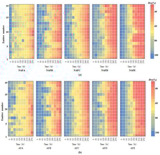 Curve of the average Dra (discharge ratio variation) of the emitter as a function of test time. (a) Dra curve for each emitter in the non-aerated drip irrigation fertilizer application experimental group. (b) Dra curve for each emitter in the WFG coupling experimental group.