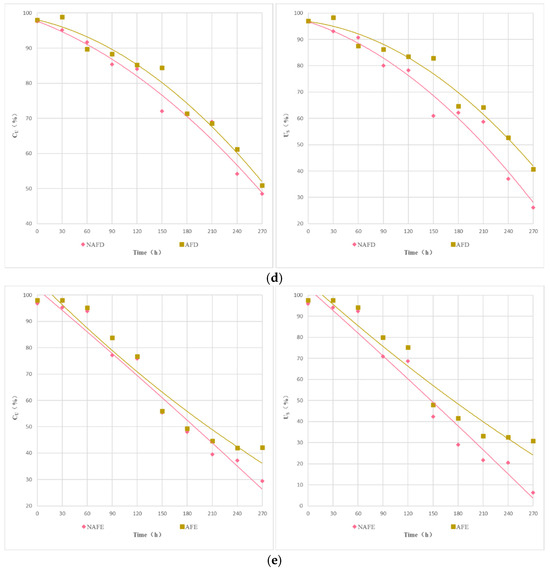 Curve of and of each emitter of test time. (a) Emitter A. (b) Emitter B. (c) Emitter C. (d) Emitter D. (e) Emitter E.
