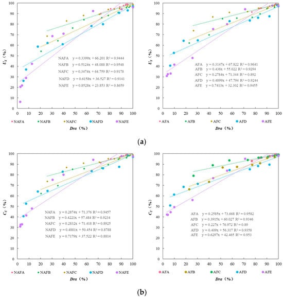 The relationship between the uniformity coefficients and Dra. (a) The relationship between (statistical uniformity coefficient) and Dra. (b) The relationship between (Christiansen uniformity coefficient) and Dra.