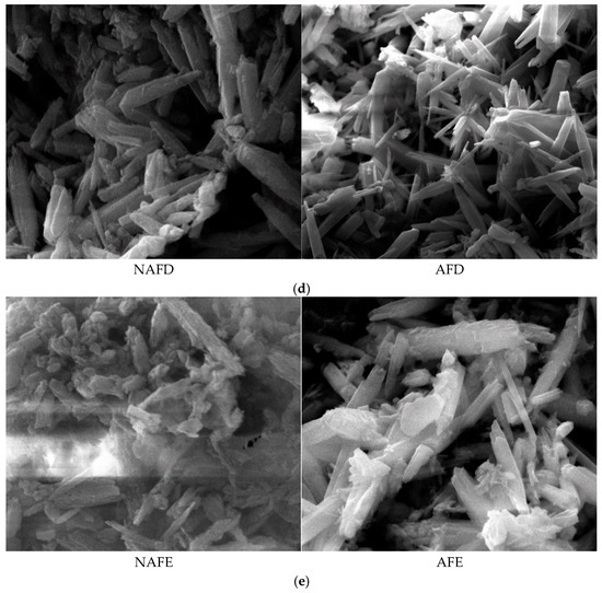The emitter clogging materials are irregularly shaped and sized cylindrical crystals, which are clustered, tightly packed, and exhibit agglomeration phenomena, as demonstrated in Figure 8. Furthermore, the surfaces of these clogging materials are coated with varying degrees of adhesive and lump-like substances. A comparison of the microscopic morphological structures of the clogging materials from the emitters in both the WFG coupling trial group and the non-aerated drip irrigation and fertigation trial group reveals that emitter A has relatively smooth and flat surfaces with fewer surface adherents in both treatment conditions. In contrast, emitter E demonstrates pronounced adhesion and agglomeration in all treatment conditions, with the degree of adhesion and agglomeration on the surface of the clogging materials following the order A < C < B < D < E, which aligns with the pattern of Dra changes observed for each emitter. A comparison of the microscopic morphological structures of the same type of emitter in the WFG coupling trial group and the non-aerated drip irrigation and fertigation trial group reveals that the thickness and density of the clogging materials under WFG coupling are lower, with less adhesion and accumulation of organic matter. In the non-aerated drip irrigation and fertigation trial group, the clogging materials of the emitters are relatively thicker and denser, which is consistent with the hypothesis that the co-application of water and fertilizer can slow down the rate of decrease in emitter Dra. Additionally, it is evident that emitters A and E, which exhibit the most pronounced alterations in Dra, also demonstrate substantial discrepancies in the microscopic morphological composition of their clogging materials subsequent to WFG co-application. These discrepancies are accompanied by discernible enhancements in surface adhesion and agglomeration, which align with the conclusion that WFG coupling effectively prolongs the clogging time of emitters A and E.