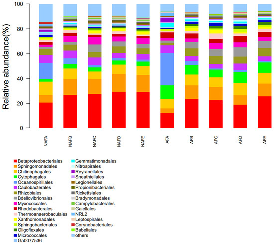 Figure 9 presents a notable disparity in the distribution of microbial communities within the clogging materials of each emitter. In conjunction with the pattern of Dra changes observed in each emitter, no discernible microbial community has been identified as a primary driver of emitter clogging. The relative abundance of microbes in the clogging materials within the emitters under both WFG coupling and non-aerated drip irrigation conditions demonstrates notable differences, indicating that microbial activity in the clogging materials also undergoes a complex process during the clogging of emitters. An examination of the distribution patterns of microbial communities in the clogging materials within the emitters in both the WFG coupling trial group and the non-aerated drip irrigation trial group reveals that under WFG coupling, a notable decrease was observed in the populations of Betaproteobacteriales, Chitinophagales, and Myxococcales, while those of Cytophagales, Babeliales, and Gemmatimonadales exhibited a significant increase.