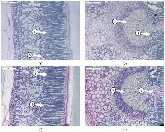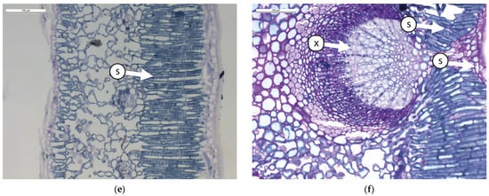 The results show that the leaves do not modify the ratio between different tissues due to the treatment (Table 1 and Figure 1). From an anatomical perspective, the leaf mesophyll consists of 3–4 layers of palisade cells (Figure 1a,c,e). In this tissue, small starch granules are present, particularly in ZN-B (Figure 1a). Below the palisade tissue, we find the spongy tissue characterized by large intercellular spaces (Figure 1a,c,e). In this tissue, no significant differences between treatments are observed. The central vein (Figure 1b,d,f) is composed of various tissues, but it causes greater wall thickening, resulting in a reduced lumen of the xylematic cells in K-B and T-B. The reduction in the diameter of xylem vessels is probably correlated with the plant’s transport capacity through the xylem. Indeed, in a study conducted by Martin-Benito et al. [38] on stressed pine plants, it was shown that drought induced the plants to allocate less carbon to the formation of tracheid cell walls, with a consequent increase in the diameter of the tracheid lumen. The authors hypothesized that this process potentially maximized hydraulic conductivity by reducing resistance to embolism. Some authors [39,40] have highlighted the positive effect of Kaolin on water stress tolerance.