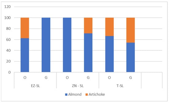 • San Lazzaro di Savena site (44°27′00″ N, 11°23′33″ E; 216 m ASL in Bologna province), in this olive orchard 25 plants for each thesis were treated with three different foliar applications: Natural Zeolite (NZ-SL) dissolved in water at a dosage of 0.6 kg/hL of H2O; Zeolite Enriched with ammonium (EZ-SL) dissolved in water at a dosage of 0.6 kg/hL of H2O; Test (T-SL) where olive trees were not treated with any compound.