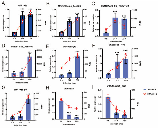 To investigate the credibility of sRNA-seq, the expression profiles of nine differentially expressed miRNAs (DE-miRNAs), including miR395a, MIR10994-p5_1ss6TC, MIR10986-p3_1ss21GT, MIR2916-p5_1ss5AG, MIR390a-p3, miR156e_R+1, MIR395c-p5, miR167a, and PC-3p-4885_278, were detected through RT-qPCR at 0 h, 24 h, and 72 h post-infection. As shown in Figure 1, RT-qPCR demonstrated that miR395a exhibited a significant increase as the infection time increases; this trend is consistent with the sRNA-seq data. Similarly, the expression levels of MIR10994-p5_1ss6TC and MIR10986-p3_1ss21GT also show an increase with the increase in the infection time, and the expression levels are also increasing. Interestingly, most of these miRNAs were upregulated at 24 h or 72 h, except miR167a and PC-3p-4885_278. In general, the results from RT-qPCR aligned well with the sRNA-seq data.