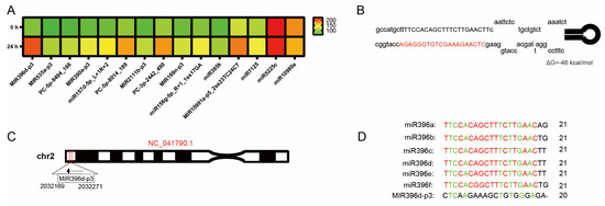 Identification and in silico analysis of MIR396d-p3. (A) The heatmap showing the MIR396d-p3 was identified post-infection. (B) The secondary structure of a MIR396d-p3 precursor sequence predicted through RNA-fold web service, with the free-energy value indicated. (C) The location of MIR396d-p3 precursor sequence on chromosome 2 in the genome, with the corresponding NCBI accession number (NC_041790.1) marked. (D) Sequence alignment of mdm-miR396 sequences. Red representative almost identical except for one base, green represents the same base.