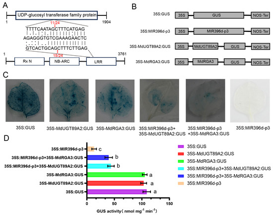 To screen the target genes of MIR396d-p3, we conducted a series of computational predictions through psRNATarget. As shown in Table S1, eight target genes were selected based on their predicted interactions with MIR396d-p3, including 1-aminocyclopropane-1-carboxylate synthase 7-like, transcription factor bHLH111-like, receptor protein kinase ZmPK1, WAT1-related protein, disease resistance protein RGA3, UDP-glycosyltransferase 89A2 (UGT89A2), peroxidase 29, and serine acetyltransferase. Next, we conducted 5′ RACE experiments on these eight target genes and found that only UGT89A2 and RGA3 interacted with MIR396d-p3 (Figure 3A). To further clarify that MIR396d-p3 can cleave MdUGT89A2 and MdRGA3 transcripts, we performed heterologous expression in N. benthamiana. First, we constructed 35S:MIR396d-p3 and the corresponding 35S-UGT89A2:GUS, 35S-RGA:GUS using the Cloning Kit V2 (Figure 3B). Then, we co-injected them into N. benthamiana to assess their expression and detected GUS activity to determine if they interacted. Meanwhile, 35S:GUS served as a positive control, and 35S:MIR396d-p3 served as a negative control. As shown in Figure 3D, 35S-UGT89A2:GUS and 35S-RGA:GUS did not show significant differences compared to 35S:GUS; however, when they were co-expressed with MIR396d-p3, their expression levels were significantly reduced, indicating that MIR396d-p3 can cleave MdUGT89A2 and MdRGA3 transcripts. GUS staining also exhibited a similar phenotype (Figure 3C).