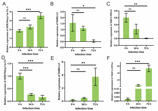 Analyses of expression patterns of MIR396d-p3 and its target genes MdUGT89A2 and MdRGA3 in the apple response to Colletotrichum gloeosporioides infection. Expression analysis of mature MIR396d-p3 in “GL-3” (A) and “FJ” (D) apple leaves at the indicated time points after inoculation with C. gloeosporioides using stem-loop RT-qPCR. Relative expression of MdRGA3 (B) and MdUGT89A2 (C) in “GL-3” apple leaves at 0, 24, and 72 h post-C. gloeosporioides infection (qRT-PCR). Relative expression of MdRGA3 (E) and MdUGT89A2 (F) in “FJ” apple leaves at 0, 24, and 72 h post-C. gloeosporioides infection (qRT-PCR). A one-way ANOVA was performed, followed by a Tukey’s test (a post-hoc test used for multiple comparisons after a significant ANOVA result). Significant differences are marked with asterisks: * p < 0.05, ** p < 0.01, *** p < 0.001. ns: not significant.