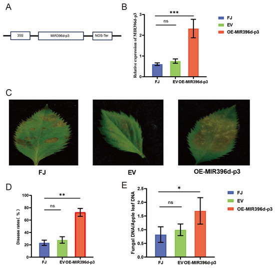 To investigate the involvement of MIR396d-p3 in the apple’s response to C. gloeosporioides, we cloned the MIR396d-p3 precursor into the pFGC5941 vector to construct the MIR396d-p3 overexpression vector (Figure 5A). Then the overexpressed constructed vector was transformed into the resistant apple cultivar “FJ” via Agrobacterium-mediated transformation. The expression level of MIR396d-p3 was assessed through RT-qPCR at 4 d post-inoculation. As shown in Figure 5B, the expression level of MIR396d-p3 was significantly higher in the MIR396d-p3 overexpression plants compared to wild-type “FJ” and the pFGC5941 EV control (EV).
