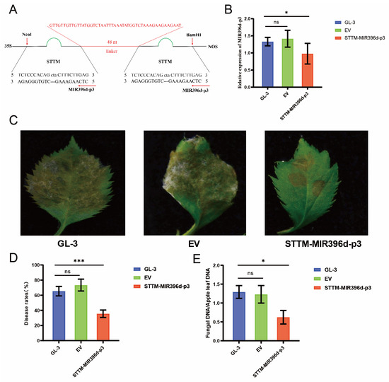 To further explore the function of MIR396d-p3 during the C. gloeosporioides infection, we constructed an MIR396d-p3 silencing (STTM-MIR396d-p3) vector using STTM technology (Figure 6A). To evaluate the efficiency of silence, the STTM-MIR396d-p3 vector was introduced into the susceptible apple cultivar “GL-3” via Agrobacterium-mediated transformation. We found that the expression level of MIR396d-p3 was significantly reduced in STTM-MIR396d-p3 plants, indicating that the MIR396d-p3 is successfully silencing (Figure 6B). Subsequently, these leaves were inoculated with C. gloeosporioides. After 2 days of inoculation, disease lesion areas were counted. Compared to the “GL-3” and EV plants, the STTM-MIR396d-p3 plants displayed significantly reduced lesion areas (Figure 6C,D). The reduced C. gloeosporioides biomass in STTM-MIR396d-p3 plants, quantified by RT-qPCR, further supports the observed effect that MIR396d-p3 silencing enhances apple resistance to C. gloeosporioides. These findings strongly indicate MIR396d-p3 negatively affects resistance to C. gloeosporioides.