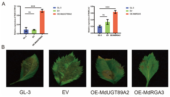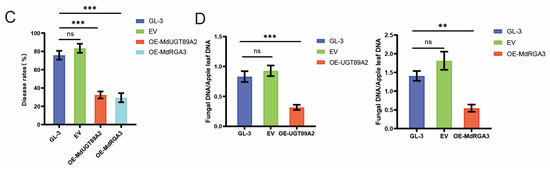 We next examined the impact of MdUGT89A2 and MdRGA3 on apple’s resistance to C. gloeosporioides. Full-length MdUGT89A2 and MdRGA3 sequences were amplified and cloned into the pFGC5941 vector to generate overexpression constructs (Figure S5). The construct was subsequently introduced into “GL-3” by Agrobacterium-mediated infiltration. RT-qPCR analysis confirmed successful overexpression of MdUGT89A2 and MdRGA3 in the OE-MdUGT89A2 and OE-MdRGA3 plants at 4 d post-transformation, respectively (Figure 7A). Lesion areas were measured 2 days following C. gloeosporioides inoculation. The OE-MdUGT89A2 and OE-MdRGA3 plants displayed a significantly reduced lesion area compared with the “GL-3” and EV plants. This similar result was further confirmed by the relative biomass (Figure 7D). These results indicated MdUGT89A2 and MdRGA3 positively regulate apple resistance to C. gloeosporioides.