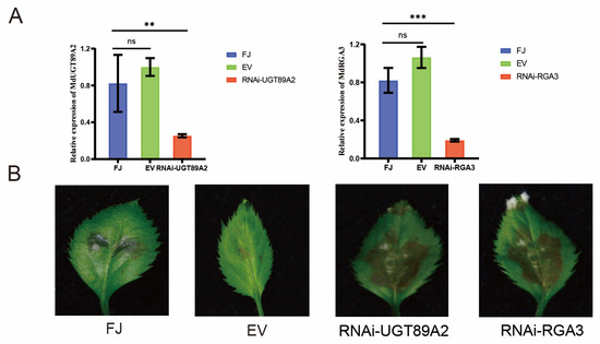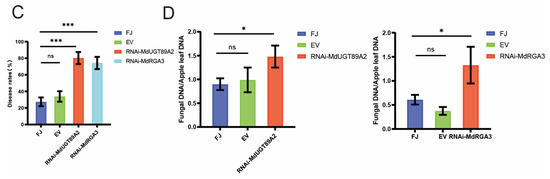 We used RT-qPCR to detect the expression level of MdUGT89A2 and MdRGA3 in the corresponding RNAi-silenced plants and found that MdUGT89A2 expression was reduced by approximately ~76.74%, while MdRGA3 expression was reduced by ~69.2%, relative to control plants (Figure 8A). Following inoculation with C. gloeosporioides, the lesion size was assessed on RNAi-MdUGT89A2, RNAi-MdRGA3, “FJ”, and EV plants at 2 d post-inoculation. Silencing of MdUGT89A2 and MdRGA3 resulted in significantly larger lesions compared to “FJ” and EV plants. Consistent with the larger lesion sizes, C. gloeosporioides biomass was significantly elevated in plants with RNAi-mediated silencing of MdUGT89A2 and MdRGA3 (Figure 8D). Collectively, MdUGT89A2 and MdRGA3 function as positive regulators of apple resistance to C. gloeosporioides.