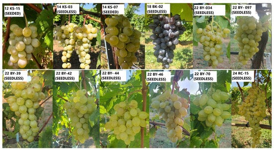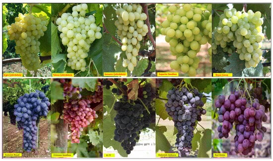 Globally, 75 million metric tons of grapes are produced worldwide, and approximately 5.6% of this production, 4.1 million tons, is produced in Türkiye. Türkiye is the world’s fifth largest grape producer in terms of area and the sixth largest in terms of production. However, it ranks very low in table grape exports, at around tenth place [1]. One of the main reasons for this situation is that the ‘Sultana seedless’ cultivar is the main cultivar produced [2,3]. As in other countries, new breeding programmes are being carried out in Türkiye to meet rapidly changing market demands. These programmes primarily aim to create cultivars with large berries, seedlessness, a crispy texture, and improved disease resistance or tolerance [4]. Approximately 71% of the world’s grape production is used for wine, 27% for table grapes, and 2% for dried grapes (raisins). With changes in consumption habits in recent years, the demand for newly developed table grapes worldwide has been increasing [5]. New high-quality grape cultivars that can meet the changing consumer demands for table grapes in different countries have begun to be grown commercially [6].