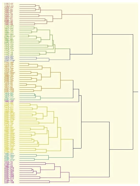 Similarity dendrogram formed as a result of evaluating fruit traits of hybrid genotypes. (* Seedless hybrids).