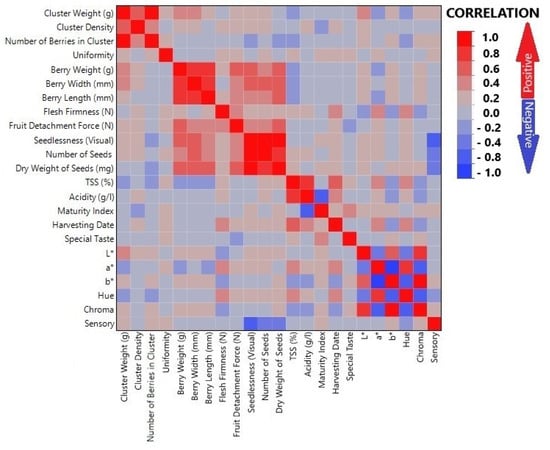 Analysis of the results of correlations on a graph of the criteria used in evaluating the different fruit traits of the grape hybrid genotypes indicated that some criteria had a very highly positive relationship with each other. In contrast, other criteria showed a highly negative relationship (Figure 3). It was found that the criteria evaluating cluster-related traits showed a highly positive relationship each other. Similar connections were noticed in the criteria related to berry size/dimensions and seed number. A negative relationship between seed status and sensory test score was determined. It was also confirmed that colour values had both highly positive and negative correlations, due to their inverse relationship.