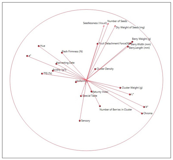 Finally, results obtained from principal component analysis (PCA) data (Figure 4) indicated that some of the evaluated fruit trait criteria acted together. Among these, seedlessness, number of seeds, and dry weight of seeds formed a group. The second group included berry-related traits, and another group contained fruit colour values such as L, b, and chroma, while in the next group there were some criteria related to fruit quality. It was also determined that the results of the sensory evaluation were in a different position to other criteria.
