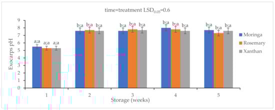 The effect of 2% moringa, 2% rosemary, and 2% xanthan edible coatings on the pH levels of ‘Ester’ granadilla exocarps during storage (5 weeks; 25 ± 2 °C; 40 ± 5%RH; 8 h light exposure); data are presented as mean ± standard error. The first letters present the significance of the difference caused by time; the second letters present the significance of the difference caused by treatments. The same letters mean a non-significant difference.
