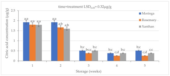 The effect of 2% moringa, 2% rosemary, and 2% xanthan coatings on the citric acid concentration of ‘Ester’ granadilla exocarps during storage (5 weeks; 25 ± 2 °C; 40 ± 5%RH; 8 h light exposure); data are presented as mean ± standard error. The first letters present the significance of the difference caused by time; the second letters present the significance of the difference caused by treatments. The same letters mean a non-significant difference.