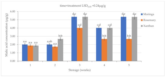 The effect of 2% moringa, 2% rosemary, and 2% xanthan coatings on the concentration of malic acid in ‘Ester’ granadilla exocarps during storage (5 weeks; 25 ± 2 °C; 40 ± 5%RH; 8 h light exposure); data are presented as mean ± standard error. The first letters present the significance of the difference caused by time; the second letters present the significance of the difference caused by treatments. The same letters mean a non-significant difference.