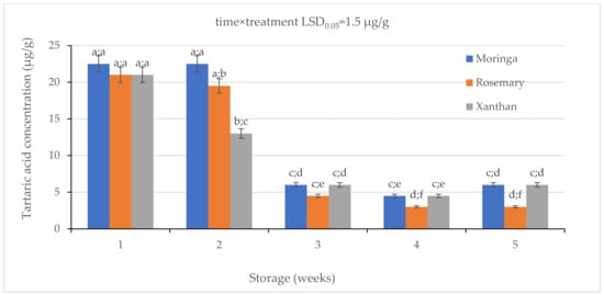 The effect of 2% moringa, 2% rosemary, and 2% xanthan coatings on the concentration of tartaric acid in ‘Ester’ granadilla exocarps during storage (5 Weeks; 25 ± 2 °C; 40 ± 5%RH; 8 h light exposure); data are presented as mean ± standard error. The first letters present the significance of the difference caused by time; the second letters present the significance of the difference caused by treatments. The same letters mean a non-significant difference.